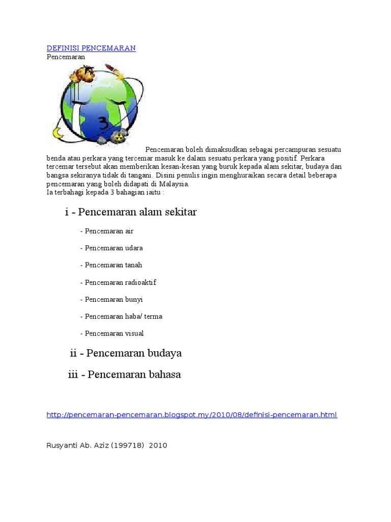Takrifan Pencemaran Bahasa Pencemaran bahasa merangkumi kesalahan bahasa dan aspek tatabahasa struktur ayat ejaan istilah penggunaan bahasa rojak dan sebagainya. Dimana antara kesan yang dianggap kronik akaibat pencemaran air yang berlaku adalah anomalia iaitu pembesaran tubuh dan tingkahlaku yang tidak normal serta kurang daya ketahanan badan akibat penggunaan sumber air tersebut e Bau busuk Bau buruk akan terhasil apabila sampah sarap yang tidak diselenggarakan dengan baik dibiarkan sahaja. Kesihatan terjejas Kesan utama pencemaran udara adalah ke atas kesihatan manusia.
